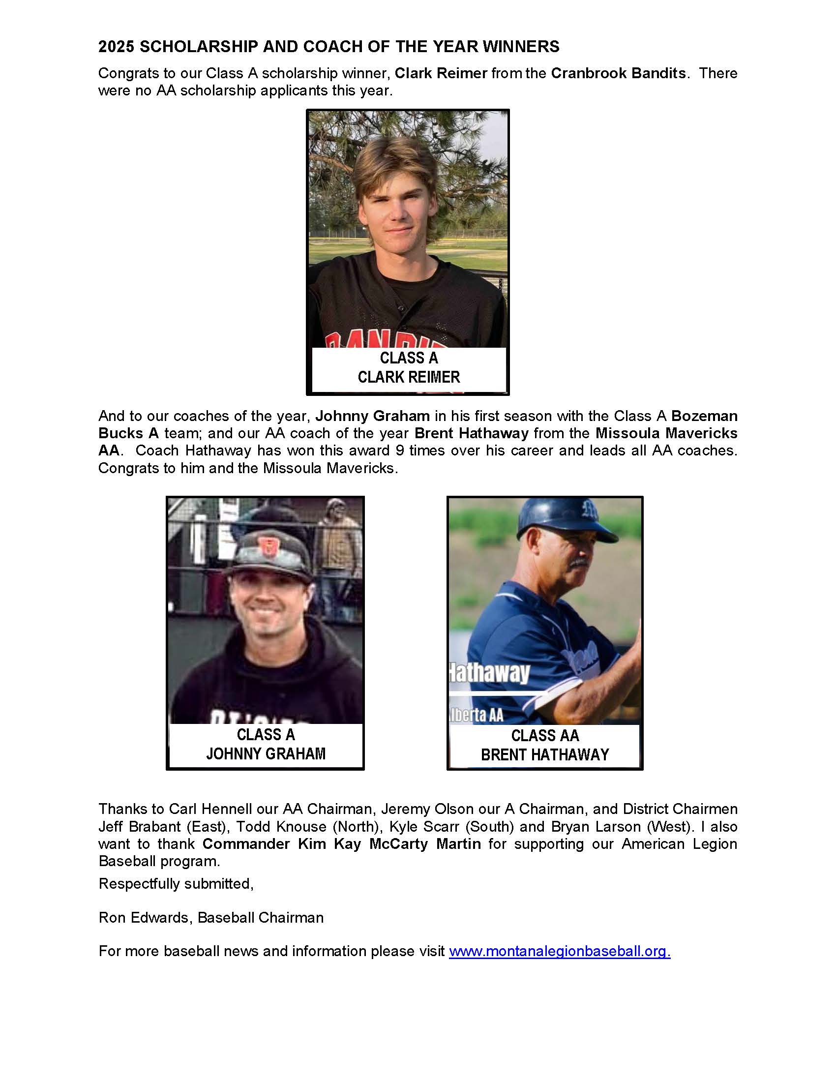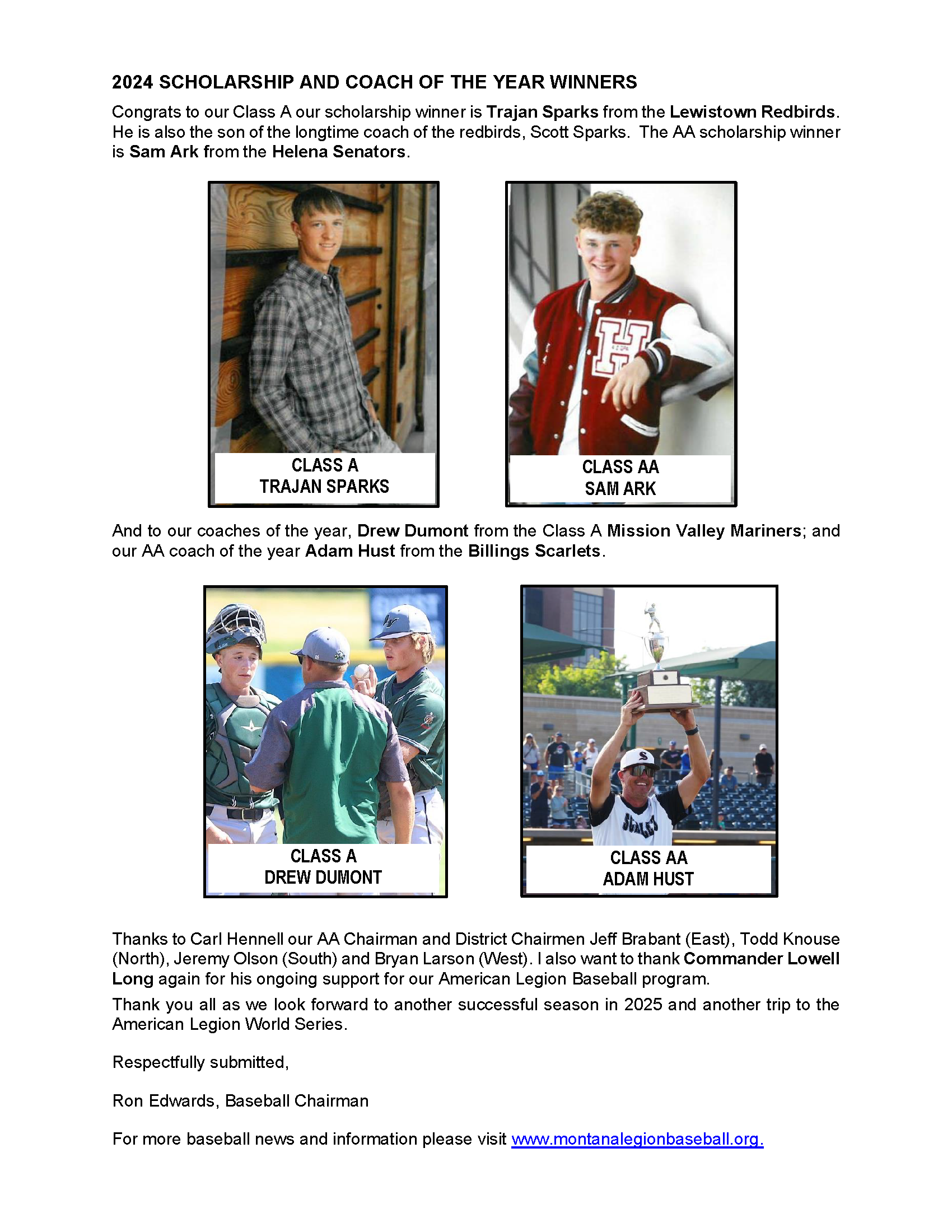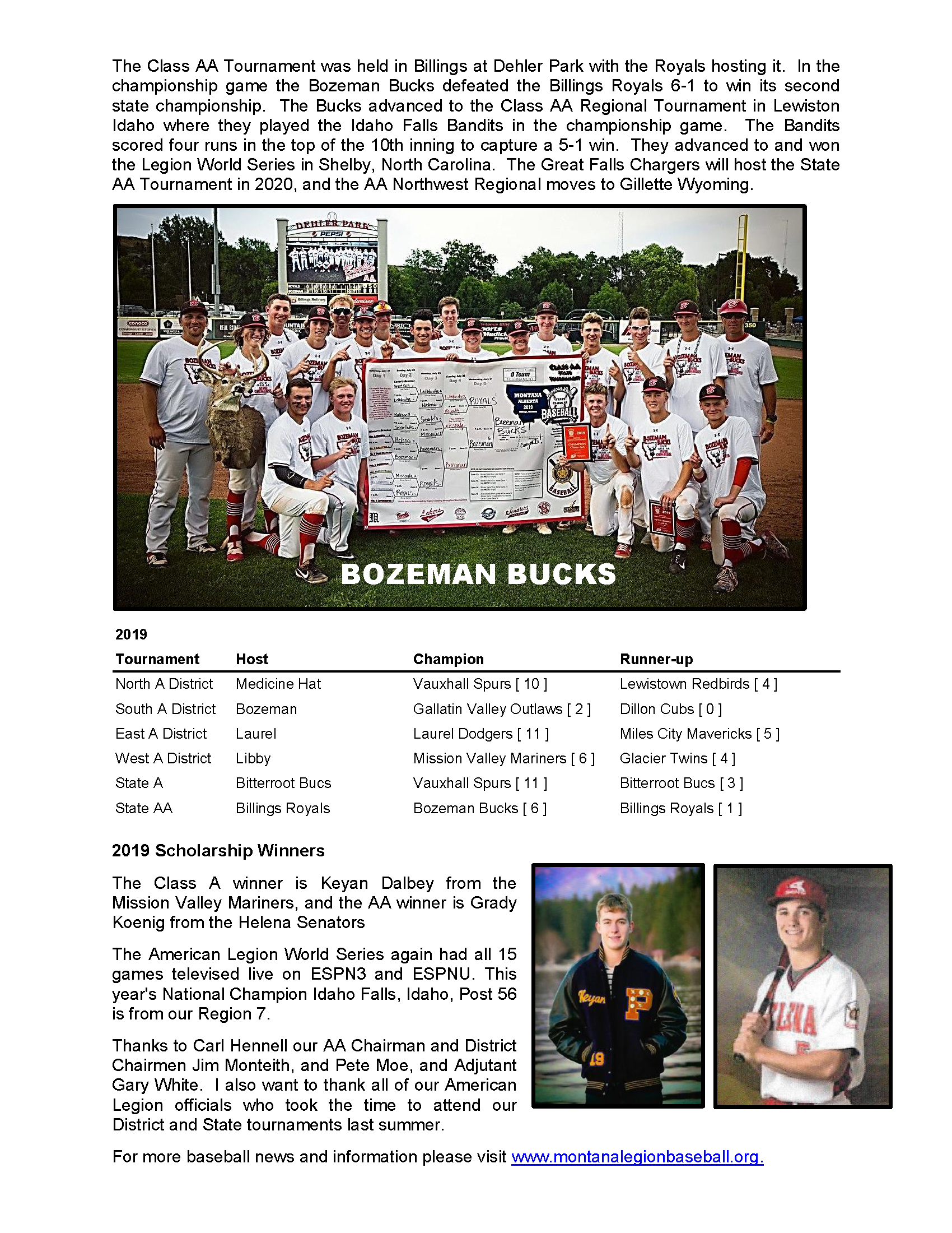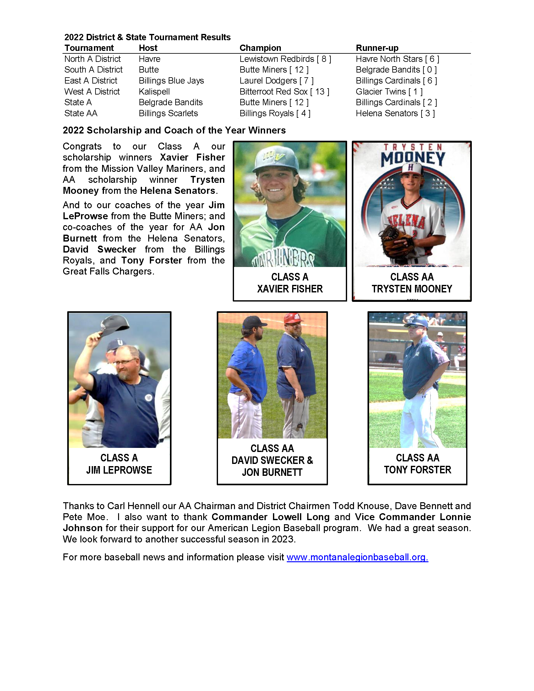 2012 Mission Valley Mariners had an outstanding year. They not only won the Class A State Tournament. They went to Burley, Idaho and won the Class A Northwest Regional Tournament. Billings hosted the Northwest Regional Tournament for Class AA teams for the second year. The Scarlets and Royals qualified for the Regional. The Royals won the Class AA State Tournament held in Whitefish. The Scarlets were runners up. Luke Reinschmidt of the Royals was selected as the MVP for the Class AA Tournament and Justin Evertz became the first Class A player to repeat as MVP for Class A Mission Valley Mariners. Cayden Napierala of the Great Falls Chargers and Jake Capko of the Bitterroot Bucs were awarded the $1,000.00 scholarships for their respective classes. Montana/Alberta American Legion Baseball had a great year with 45 teams and over 700 student athletes participating.