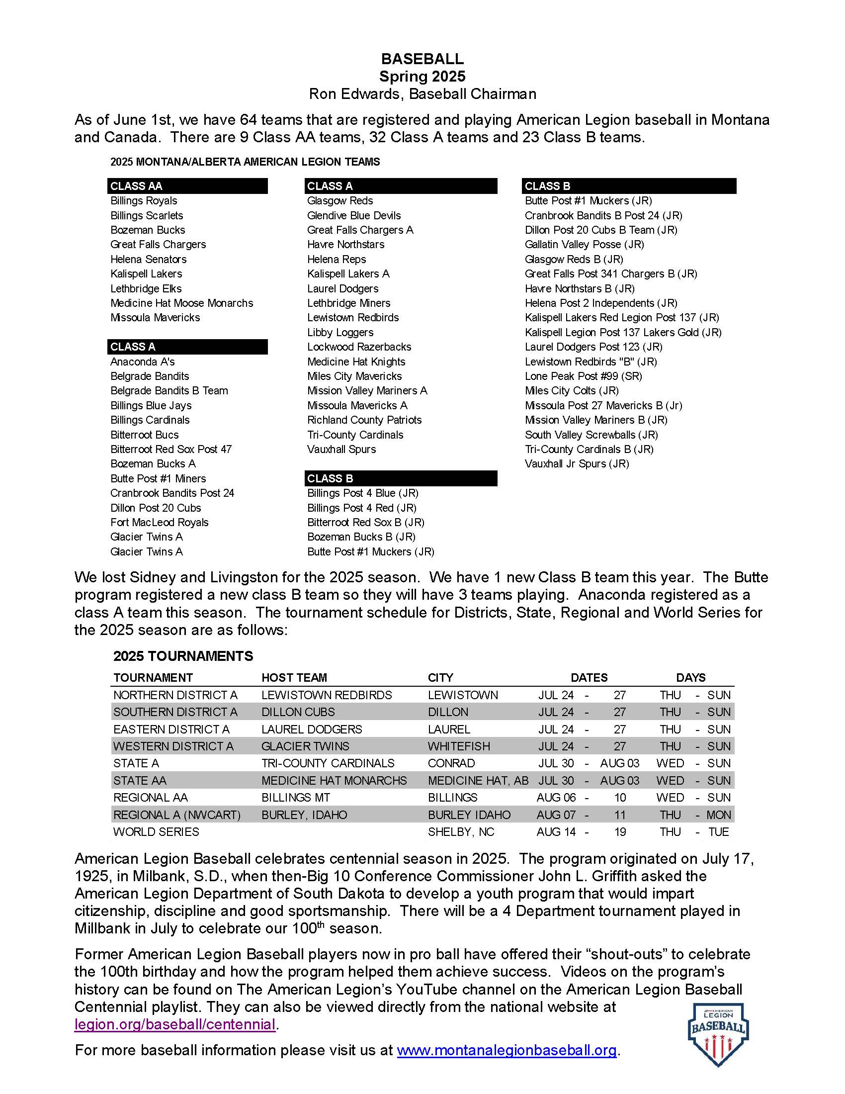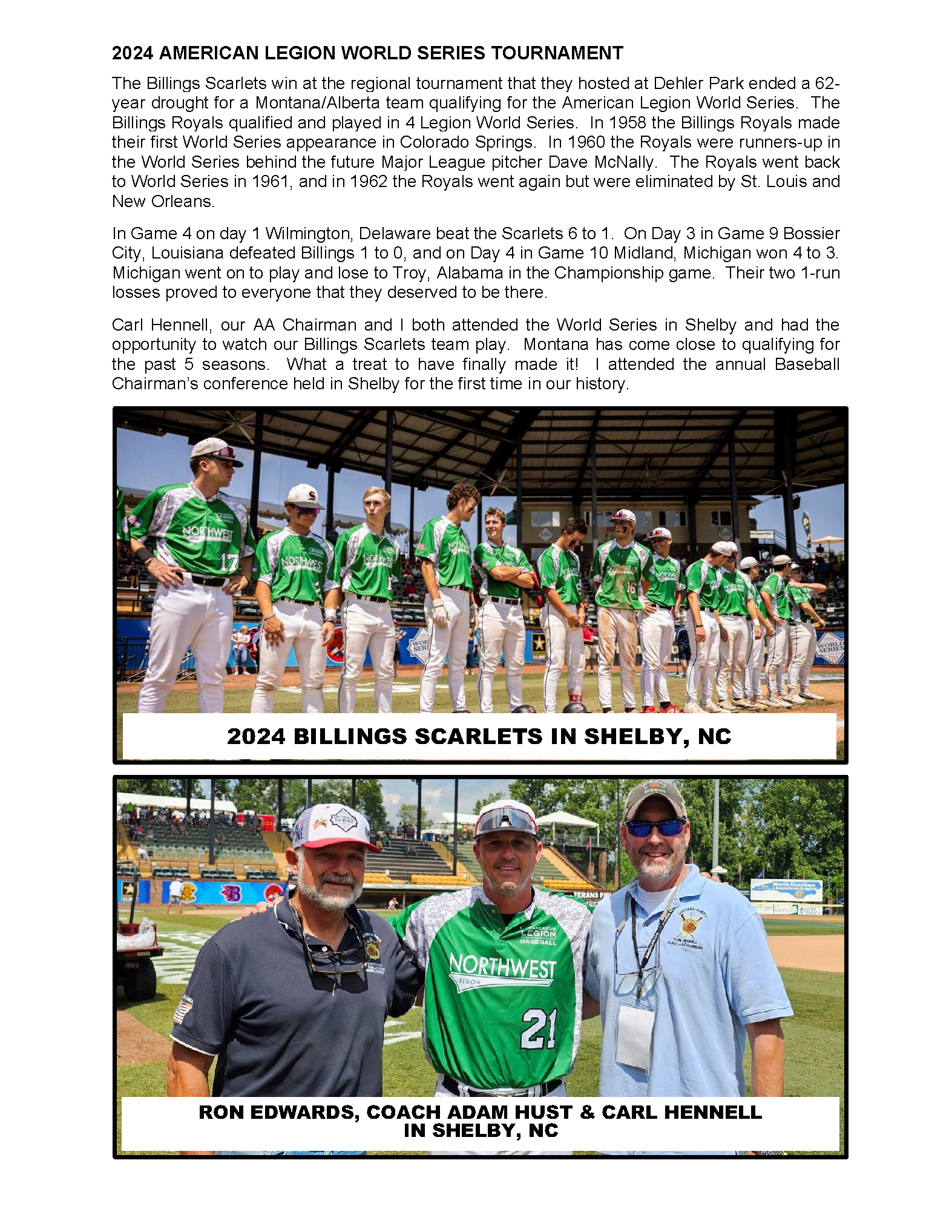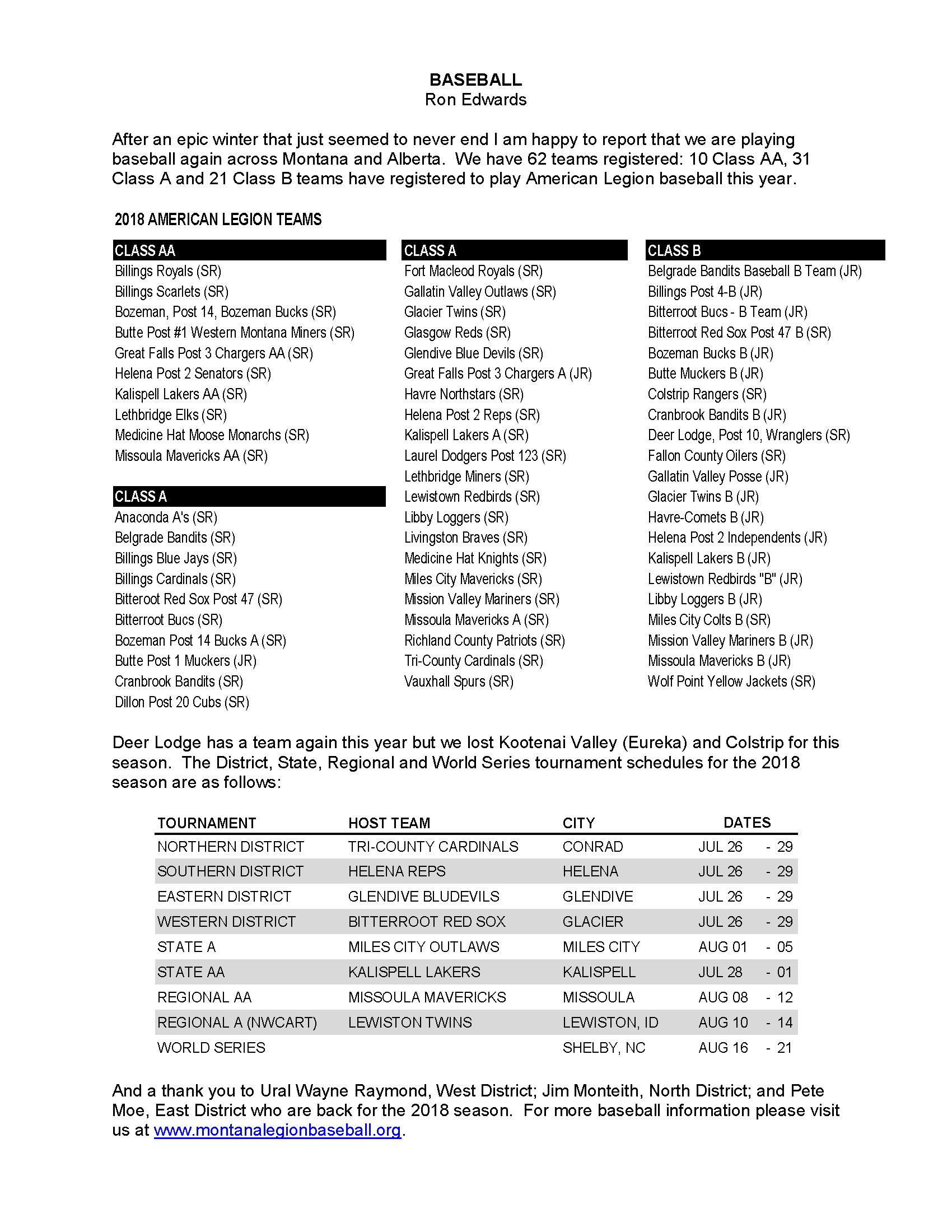 2016 After 20 years as our State Baseball Chairman, George Haegele decided to hang up his cleats at the end of the season. Thanks you George for your years of dedicated service to Montana/Alberta American Legion baseball program. The Bitterroot Red Sox won their second straight State Class A Championship. and then went on to win their second straight Northwest Class A Tournament Championship which was hosted by the Laurel Dodgers. The Billings Scarlets won the their second straight State Class AA championship which was hosted by the Missoula Mavericks. The American Legion World Series was won by the team from Texarkana, Arkansas.