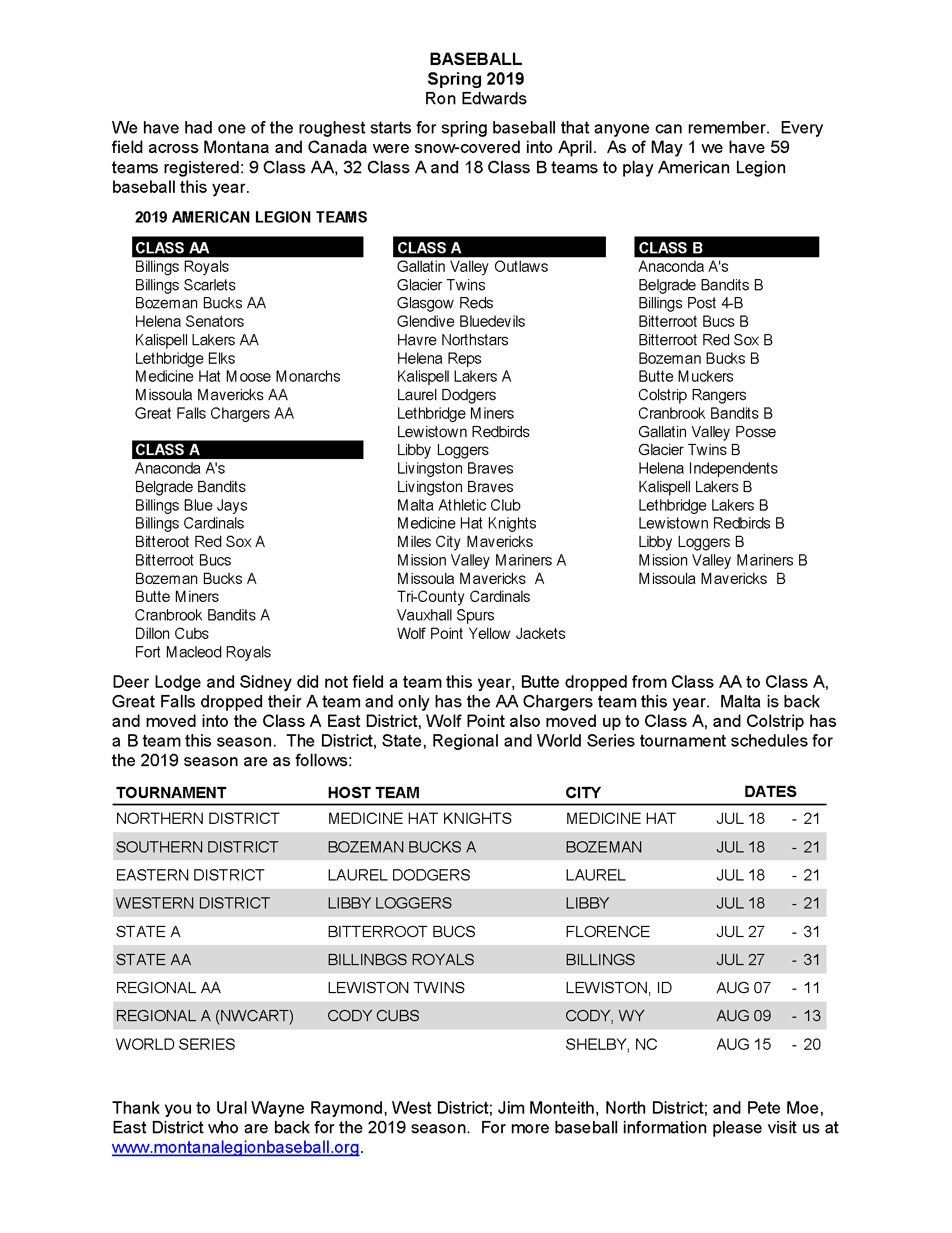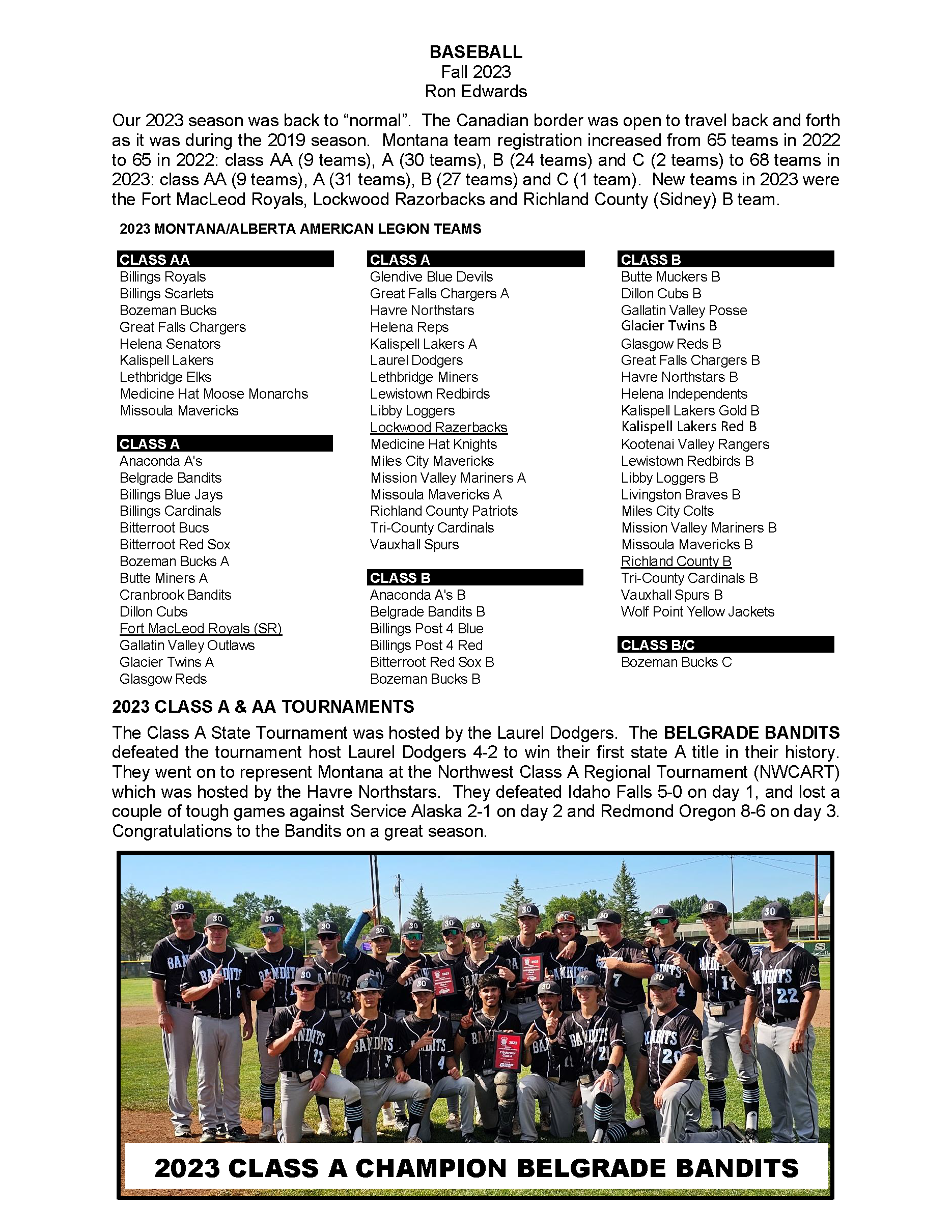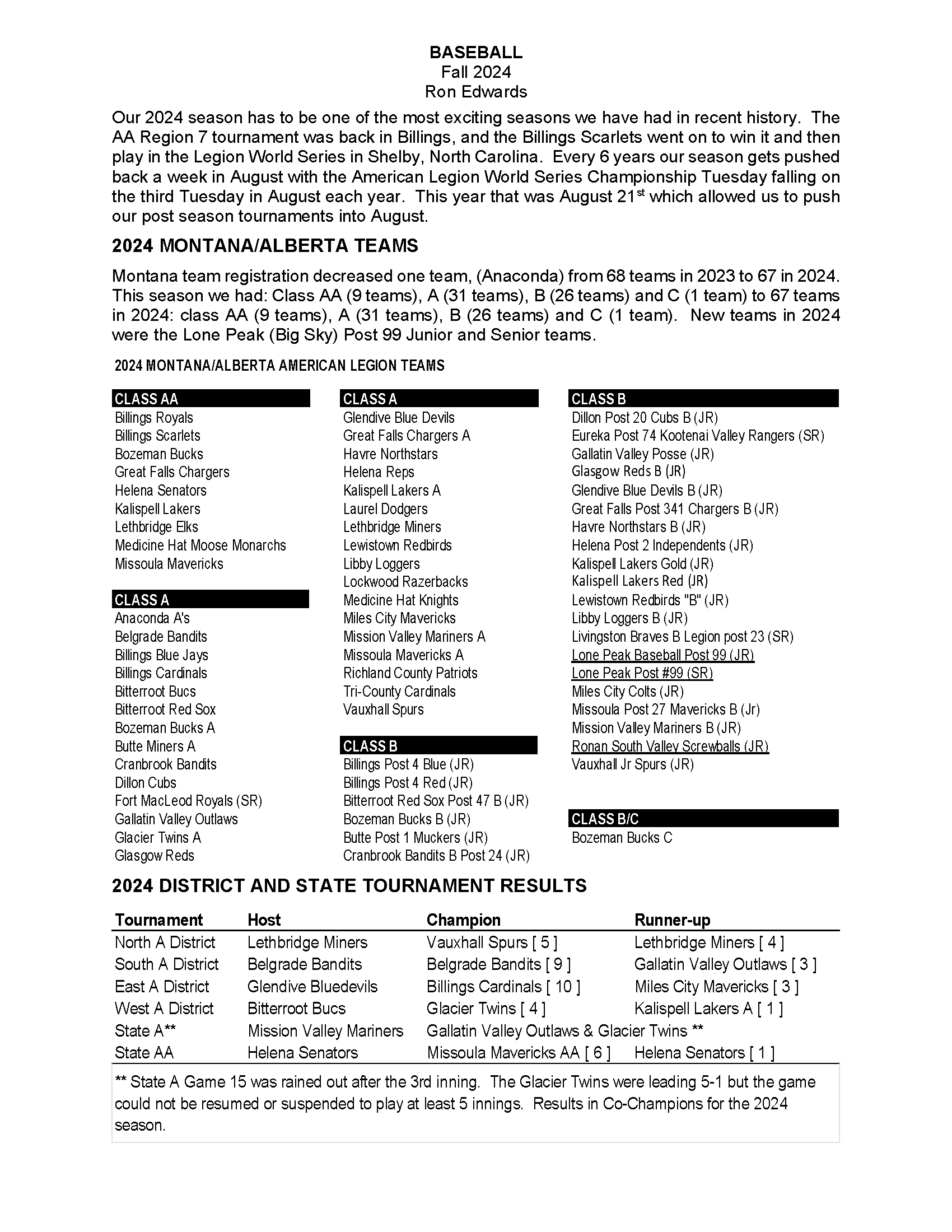 2016 After 20 years as our State Baseball Chairman, George Haegele decided to hang up his cleats at the end of the season. Thanks you George for your years of dedicated service to Montana/Alberta American Legion baseball program. The Bitterroot Red Sox won their second straight State Class A Championship. and then went on to win their second straight Northwest Class A Tournament Championship which was hosted by the Laurel Dodgers. The Billings Scarlets won the their second straight State Class AA championship which was hosted by the Missoula Mavericks. The American Legion World Series was won by the team from Texarkana, Arkansas.