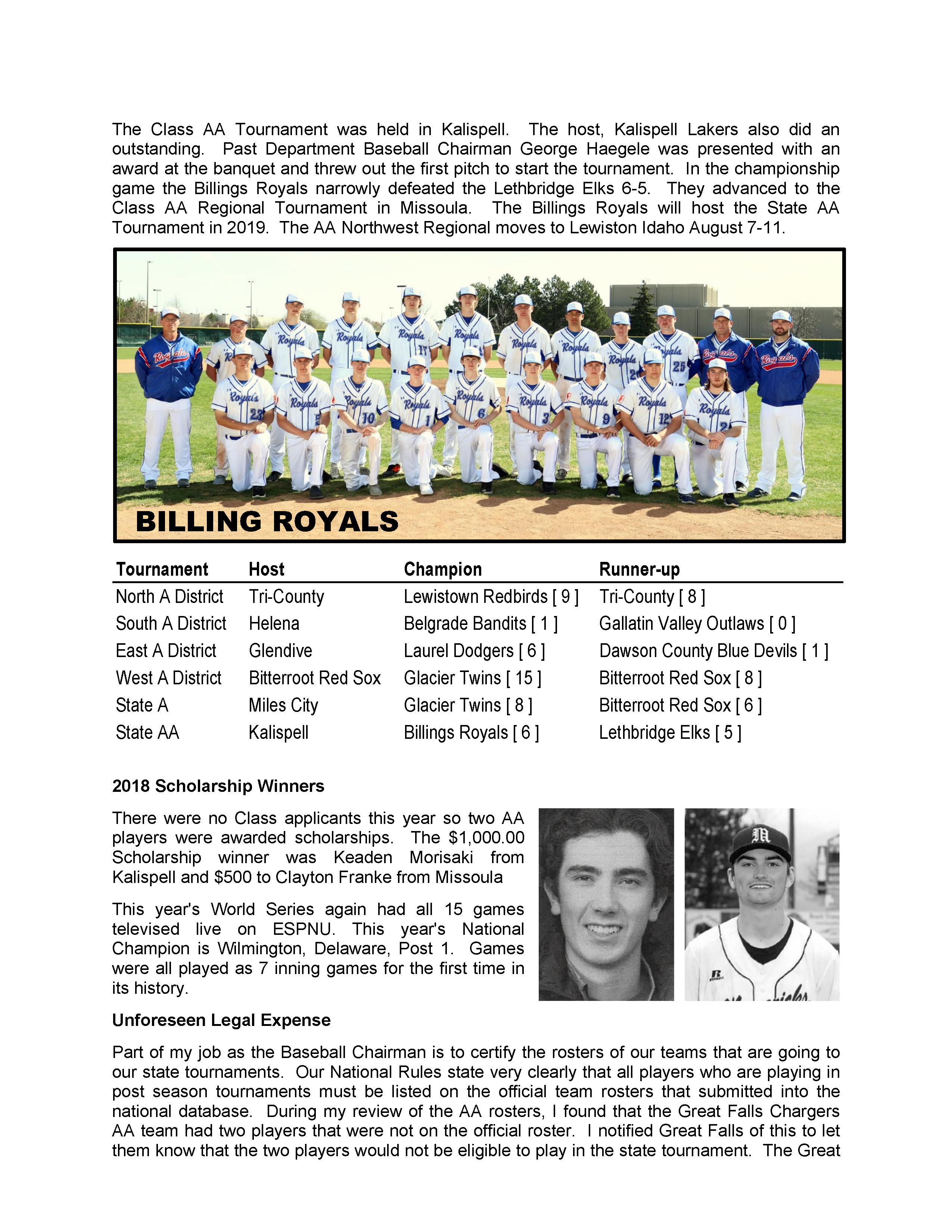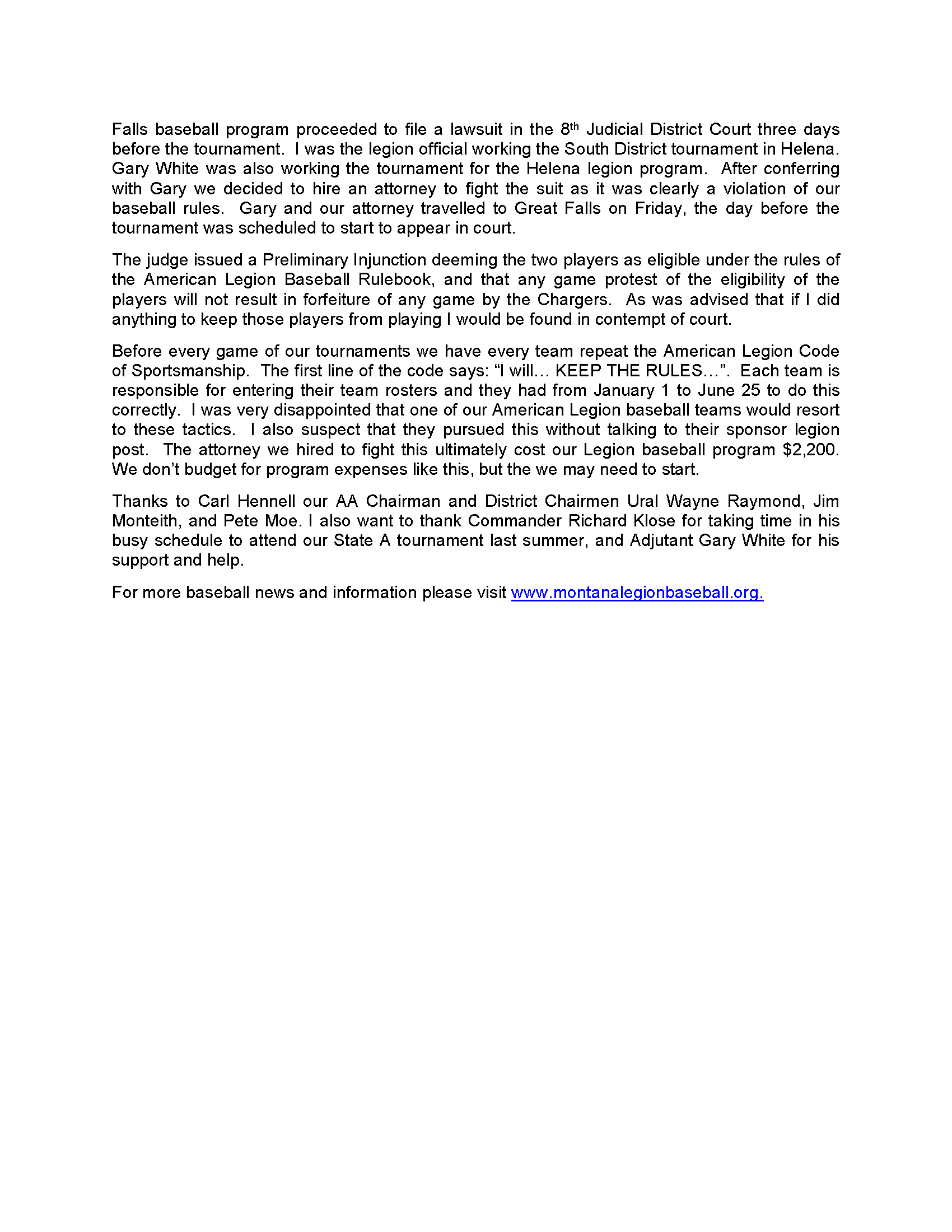 2013 Laurel Dodgers won the Class A State Championship. They were eliminated at the Regional Tournament in a semi-final game by a team from Utah. This was Laurel's fourth State Championship in the last five years. Billings Royals repeated as Class AA State Tournament Champion. Missoula Mays were runner-up. The Royals defeated Wyoming in Game 1. They went on to lose to Washington 5-4 and then to eventual Champion Hawaii 7-4. Cranbrook, British Columbia joined us as a Class B Team. Northwest Region winner Hawaii finished in third place at the American Legion World Series. Carl Hennell of Kalispell was named to the National Baseball Sub-committee. Congratulations Carl on this prestigious appointment.