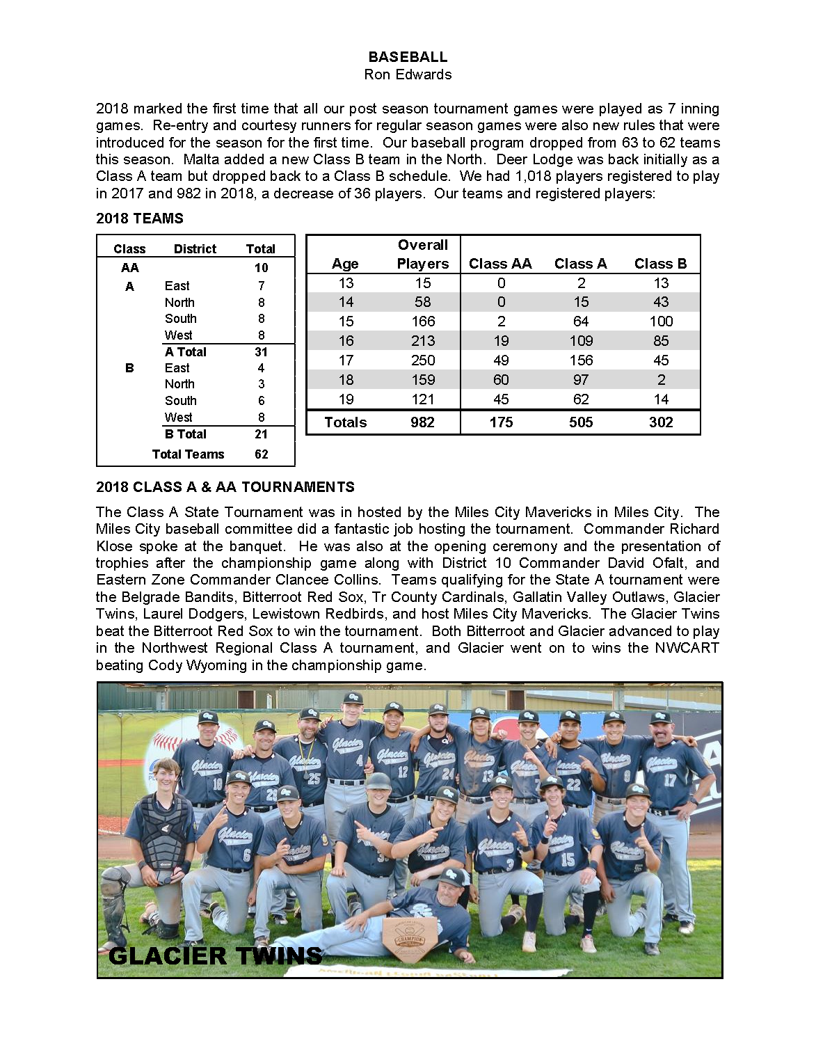 2014 We had 56 Teams competing in three categories, Class AA, Class A, and Class B. Approximately 900 players and 150 coaches participated in Montana. We had 1 team from British Columbia, 7 from Alberta and 48 from Montana. Glacier Twins (Whitefish) won the Class A Championship and participated in the Regional Tournament in Alaska. All reports were they had a great experience. Missoula was Class AA Champion. We had an informal Invitational Class B Tournament won by Cranbrook, BC. Glacier Twins were 2-2 at the Regional in Alaska won by Pocatello, Idaho. Missoula defeated Idaho, lost to Oregon and was eliminated by eventual Champion Hawaii. Hawaii went to the World Series where they were the runner-up in Pool B. They were then eliminated by the Pool A winner and eventual repeat World Series Champion New Jersey.